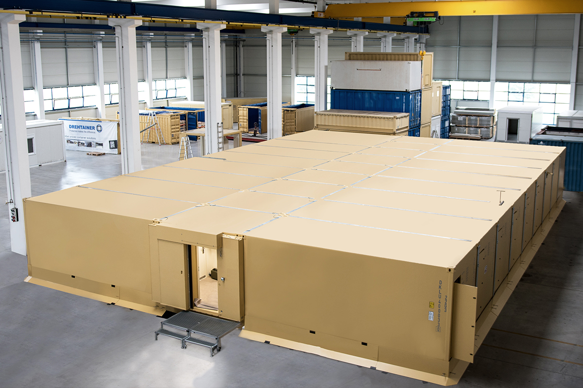 Our product portfolio in the field of defence technology includes protected and unprotected infrastructure, solutions for operating base protection and command posts, as well as various types of containers for special applications. The unique, modular system is something that makes our containers stand out. It allows the containers to be coupled with each other, making it possible to erect small spatial units as well as complete buildings. The level of protection can be adjusted to suit the respective requirements by means of integration and/or adaptation for individual containers or for complete buildings (tested and certified in accordance with STANAG 2280 or 4569).